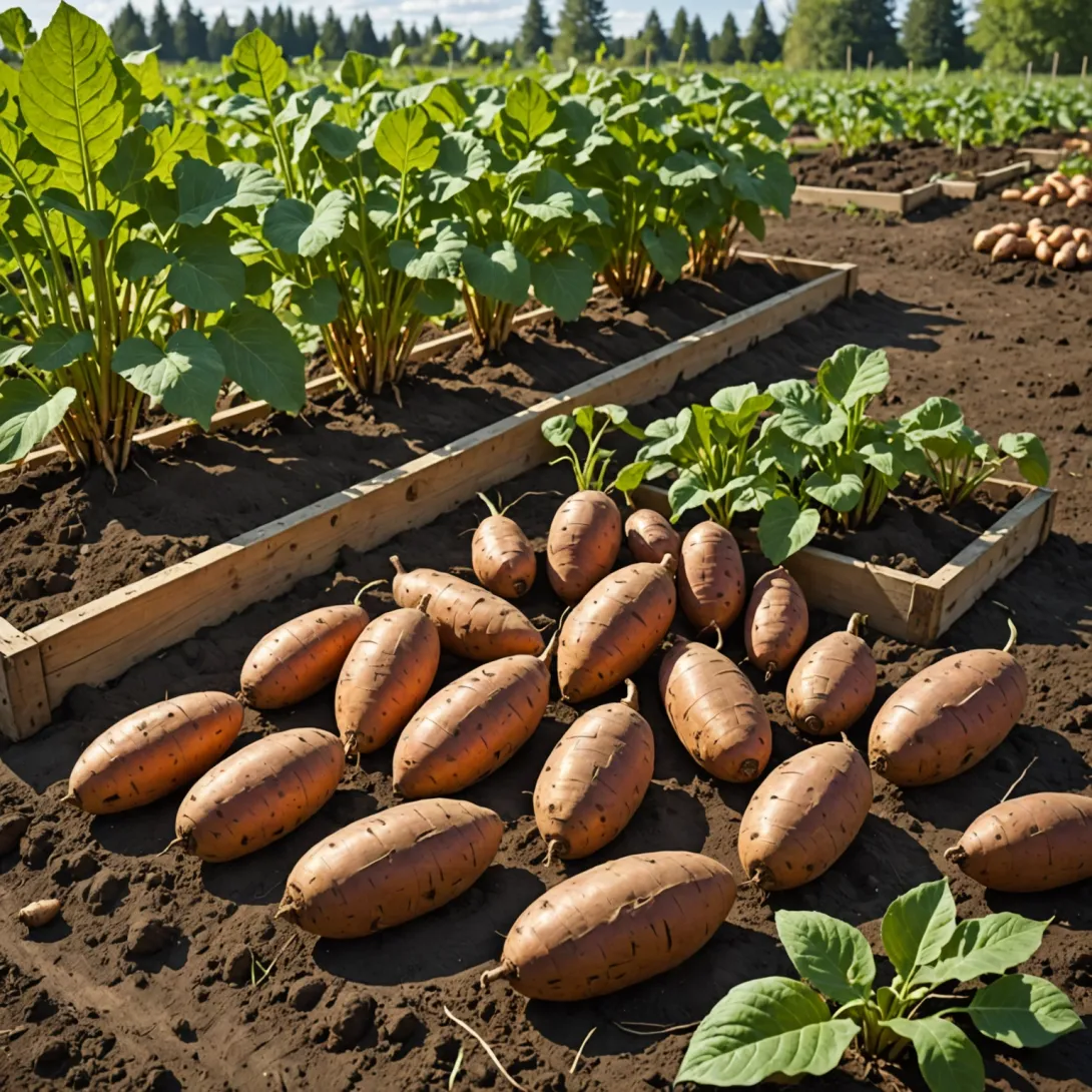 Далее следует посадка в подготовленную почву, учитывая оптимальные глубину и расстояния между растениями. Батат требует регулярного полива, но без застоя воды, а также периодического рыхления и подкормок для поддержания плодородия почвы.