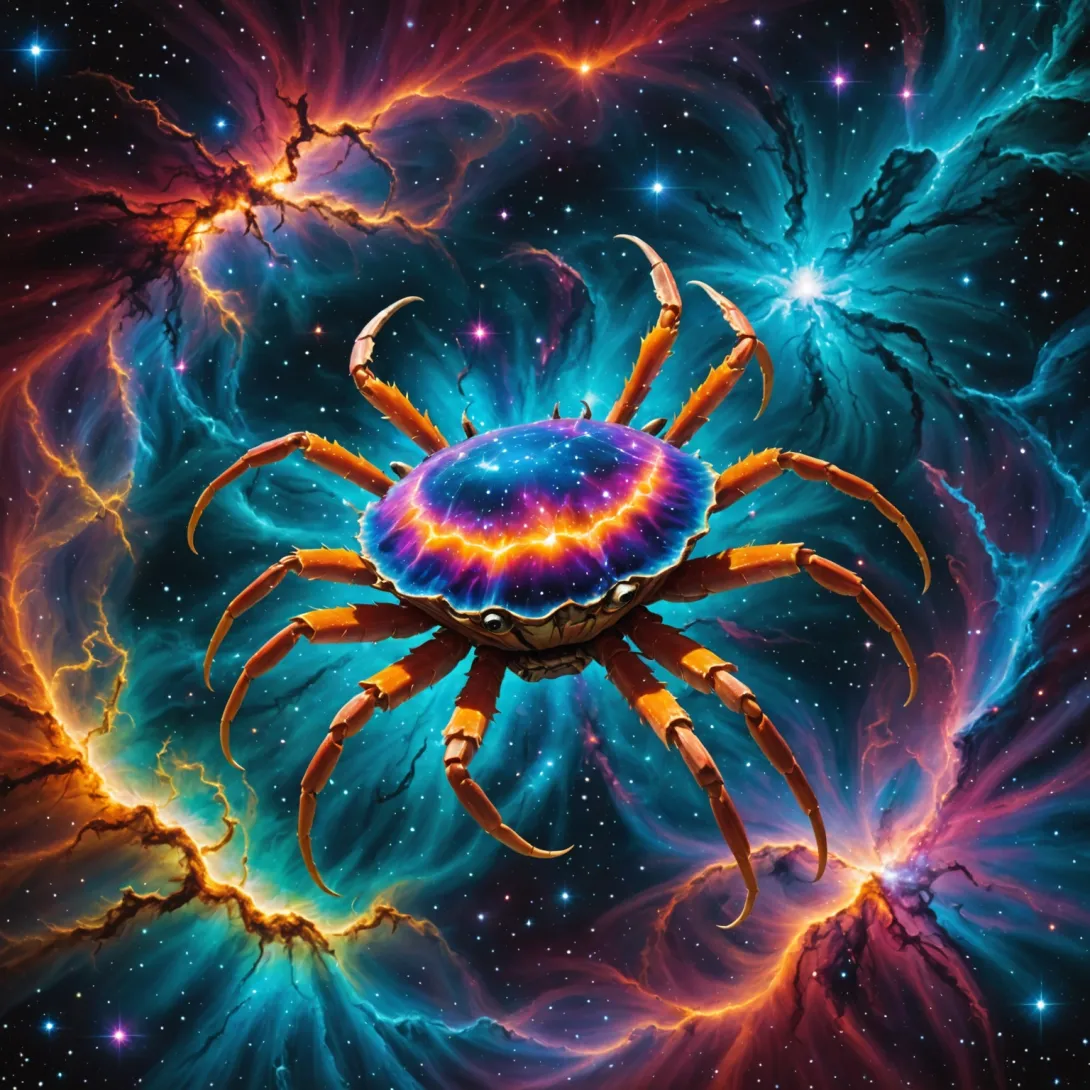 Крабовидный пульсар — это остаток сверхновой, взрыв которой произошёл в 1054 году. Его красота заключается в ярком и сложном пульсарном ветре, который взаимодействует с окружающей туманностью, создавая завораживающие структуры и световые эффекты.